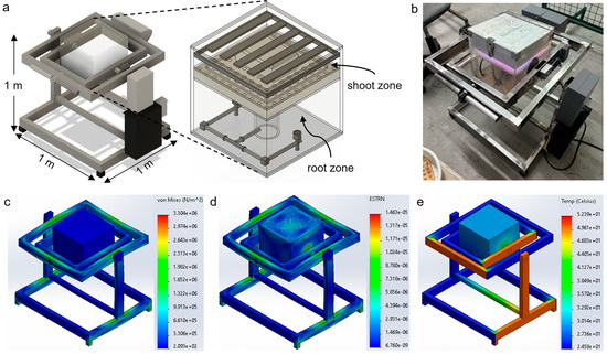(a) Final grow chamber and clinostat platform design with mechanical fastening via rubber-dampened aluminum brackets; (b) fabricated clinostat with integrated vibration control; and (c) von Mises static stress, (d) equivalent static strain (ESTRN), and (e) dynamic thermal characterization of the platform in ANSYS 2024 R2. Although simulations confirmed low mechanical stress under load, additional smoothness control was implemented via motor drivers and acceleration ramping to protect photosynthetic tissues during rotation.