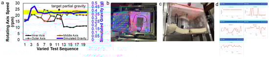 The orientation of the developed clinostat in three dimensions can be shown visually with a three-axis rotation (Figure 2a). The outermost, center, and innermost perpendicular axes of the clinostat schematic each indicate a distinct rotational direction (Figure 2a). The center axis spins around the vertical axis through a worm gear motor, the innermost axis rotates around the axis perpendicular to the center axis (horizontal), and the outermost axis rotates around the horizontal axis. This configuration allows quick and stable transition from simulated rotation or gravity to another. Three controlled motors are responsible for the independent rotation of each axis with rotation based on the gravitational force conversion (1), Euclidean norm vector magnitude (2), angular velocity conversion (3), and radial acceleration formula (4), where g is the Earth’s gravitational constant, with a value of 9.81 m/s2; gtarget is the target g-value; gtotal is the magnitude g-value considering the three axis gravity values gx, gy, and gz for 3-axis rotation; ωi is the angular velocity (rad/s) of the central axis (grow chamber); Ni is the rotational speed of each rotating axis; gi is the centripetal acceleration of an axis (m/s2); and r is the radius of rotation (m) that is 0.5 m in this case.