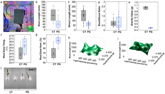 (a) Sample grown maize seedlings inside the fabricated grow chamber after 7 days under partial gravity (top view); comparisons of control treatment (CT) and partial gravity (PG)-treated maize seedlings for triplicates based on (b) root length, (c) shoot length, and (d) root/shoot ratio; measured (e) gravity, (f) root zone temperature, and (g) root zone humidity inside the chamber during cultivation; and (h) root and (i) shoot dynamics in relation to gravity and light intensity exposure. (j) Sample CT and PG-treated seedlings on the 7th day after sowing (DAS). Note: Surface plots are interpolated visualizations based on seedling observations and are meant to highlight directional trends, not precise biological gradients. Apparent sharp peaks may result from local data variation amplified by the interpolation algorithm.