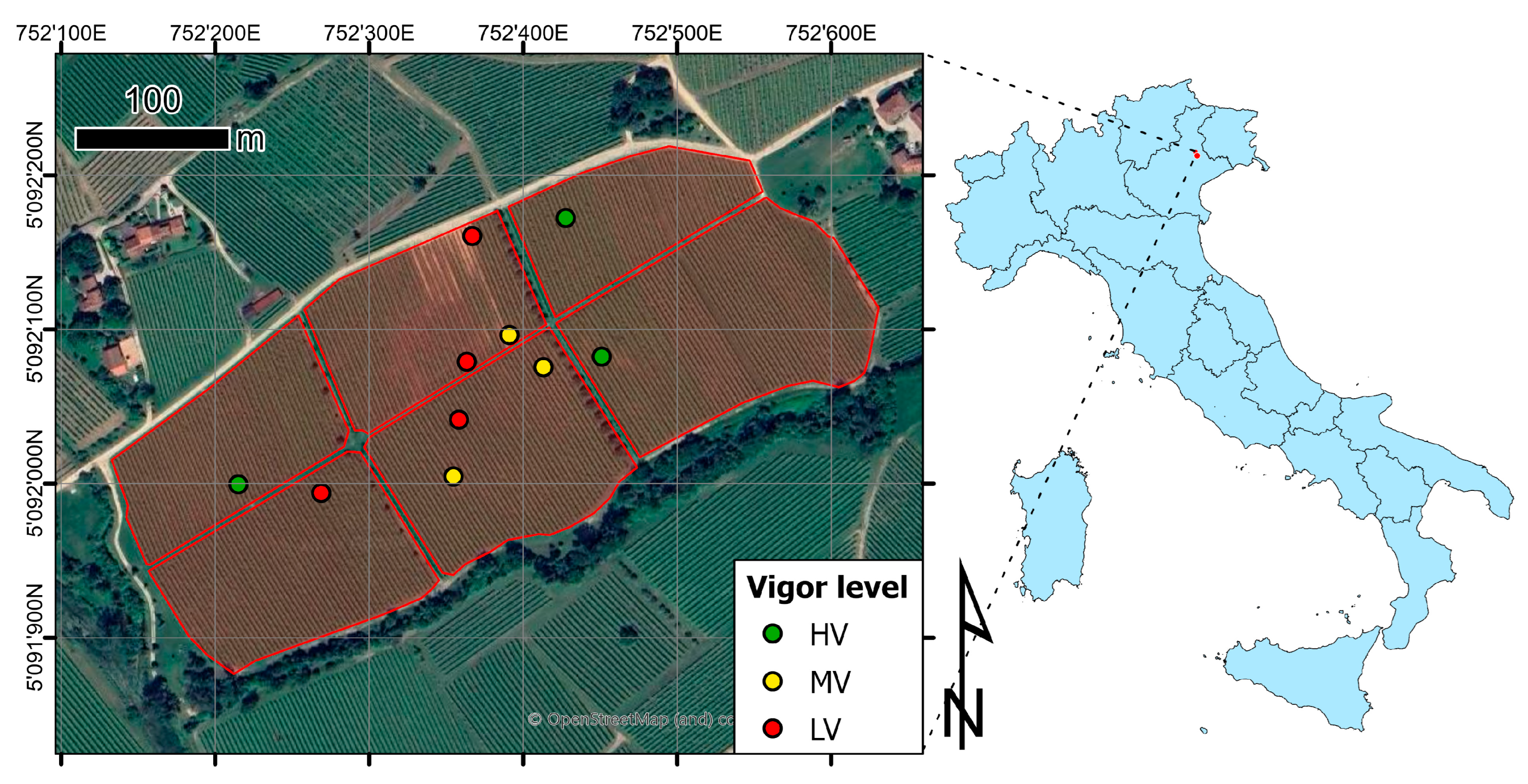 - Gatti, M.; Garavani, A.; Squeri, C.; Diti, I.; De Monte, A.; Scotti, C.; Poni, S. Effects of Intra-Vineyard Variability and Soil Heterogeneity on Vine Performance, Dry Matter and Nutrient Partitioning. Precis. Agric. 2022, 23, 150–177. [Google Scholar] [CrossRef]