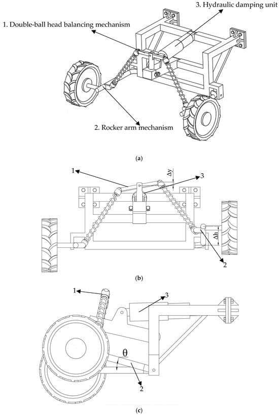The profiling wheel mechanism mainly consists of a rocker arm mechanism, a double-ball head balancing mechanism, and a hydraulic damping unit (Figure 1). Its core function is to achieve horizontal stability of the frame and terrain adaptability through multi-level adjustment. A parametric modeling method is used in the design process and key geometric parameters are determined according to suspension optimization criteria.