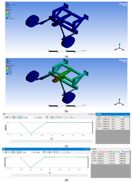 Mechanical analysis results: (a) Schematic diagram of the static analysis of the front rocker arm 1; (b) Schematic diagram of the static analysis of the front rocker arm 2; (c) Maximum stress plot over time; (d) Maximum strain plot over time.