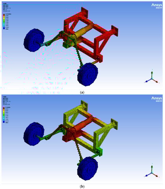Rigid-flexible coupling simulation errors mainly come from three sources. Flexible body modal truncation accounts for 65% of the total error, as only the first 10 orders of modes were retained, thereby missing high-frequency vibration components (15–25 Hz) and leading to incomplete characterization of local deformation at the rocker arm root. Mesh sensitivity contributes about 20%, since the 3 mm mesh used is less accurate in capturing stress gradients in high-stress regions (e.g., rocker arm root fillets) than a 2 mm fine mesh, overestimating the maximum stress by 4.3%. Finally, boundary condition simplification causes roughly 15%, due to the frame being set as a “full fixed support” (ignoring ball joint micro-rotation) and the hydraulic force applied as a “point load” (instead of the real distributed load), which stiffens the model and concentrates stress.