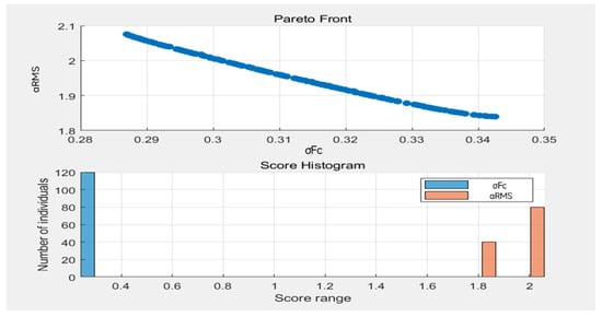 After 100 generations of iteration, the Pareto optimal solution set is obtained (Figure 5), with the following selected optimal parameters: , , . The horizontal axis represents the contact force fluctuation coefficient and the vertical axis represents the root-mean-square vibration acceleration with the unit of g. The observed performance improvements are as follows: reduced from 0.34 to 0.29 (↓14.7%) and reduced from 2.1 g to 1.8 g (↓14.3%).