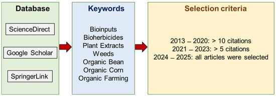 This study presents bioinputs as an alternative to decreasing the extensive use of agrochemicals. Bioherbicides are highlighted, demonstrating their potential and the need for further research. To gather this information, a search for articles using plant extracts for weed control was conducted in the databases ScienceDirect, SpringerLink, and Google Scholar, using the following keywords: “bioinputs”, “bioherbicides”, “plant extracts”, “weeds”, “organic bean”, “organic corn”, and “organic farming”. Articles from 2013 to 2025 were selected. From 2013 to 2020 and 2021 to 2023, articles with more than 10 and 5 citations, respectively, were chosen. All articles published in 2024 and 2025 were included for review (Figure 1). Similarly, patent searches were performed using the keywords “plant extracts,” “bioherbicide,” “weeds,” “organic bean,” “organic corn,” and “organic farming” on the Espacenet (https://worldwide.espacenet.com/) (accessed on 29 April 2025), WIPO (https://www.wipo.int/portal/en/index.html) (accessed on 29 April 2025), and INPI (https://www.gov.br/inpi/pt-br/servicos/patentes) (accessed on 16 May 2025) platforms.