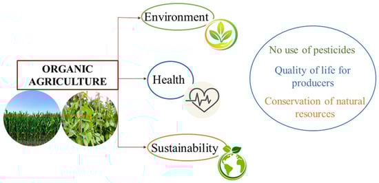 Organic farming is defined as the cultivation of food in a sustainable manner, harmless to the environment and human health. To achieve this, a natural production technique refrains from using agrochemicals and respects the soil, water, and animals [5,30]. It is based on the pillars of: (i) health, prioritizing food quality; (ii) environment, aiming to produce without harming available natural resources; and (iii) sustainability, aiming to adopt ecologically sound practices to ensure a better world for future generations (Figure 3).