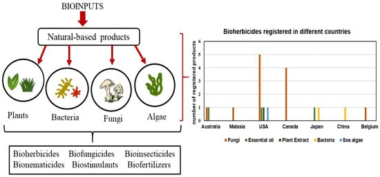 Bioinputs are alternatives to chemical products. They are produced from natural sources such as plants or microorganisms. They offer an alternative for the sustainable control of diseases, insects, nematodes, and weeds, being less toxic to the environment and living organisms. Unlike traditional chemical products that are registered per crop, bioinputs are registered based on the target. Hence, they can be classified as bioherbicides, biofungicides, bioinsecticides, bionematicides, biostimulants, and biofertilizers (Figure 4). The number of bioherbicides registered in certain countries is also shown in Figure 4.
