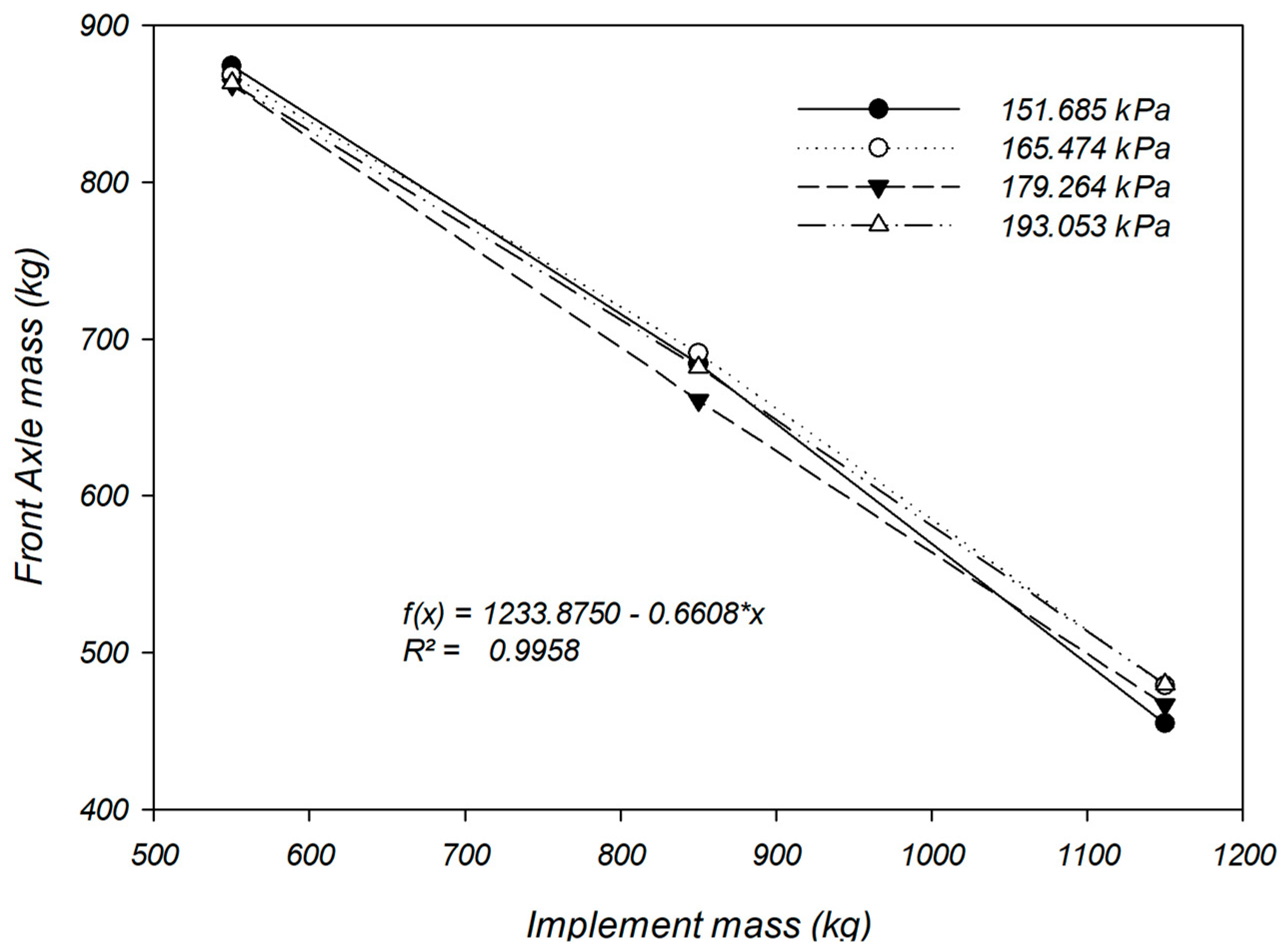 2 = 0.9958), configuring consistency in measured physical behavior. Numerically, for every 100 kg added to the implement, an average reduction of approximately 66 kg occurs in the front axle load. This behavior and the negative curve slope confirm the load transfer from the front axle to rear, a direct consequence of implement coupling to the tractor rear via the three-point hydraulic system. It is important to highlight that the pressure variation in tires, despite presenting a statistically significant effect according to