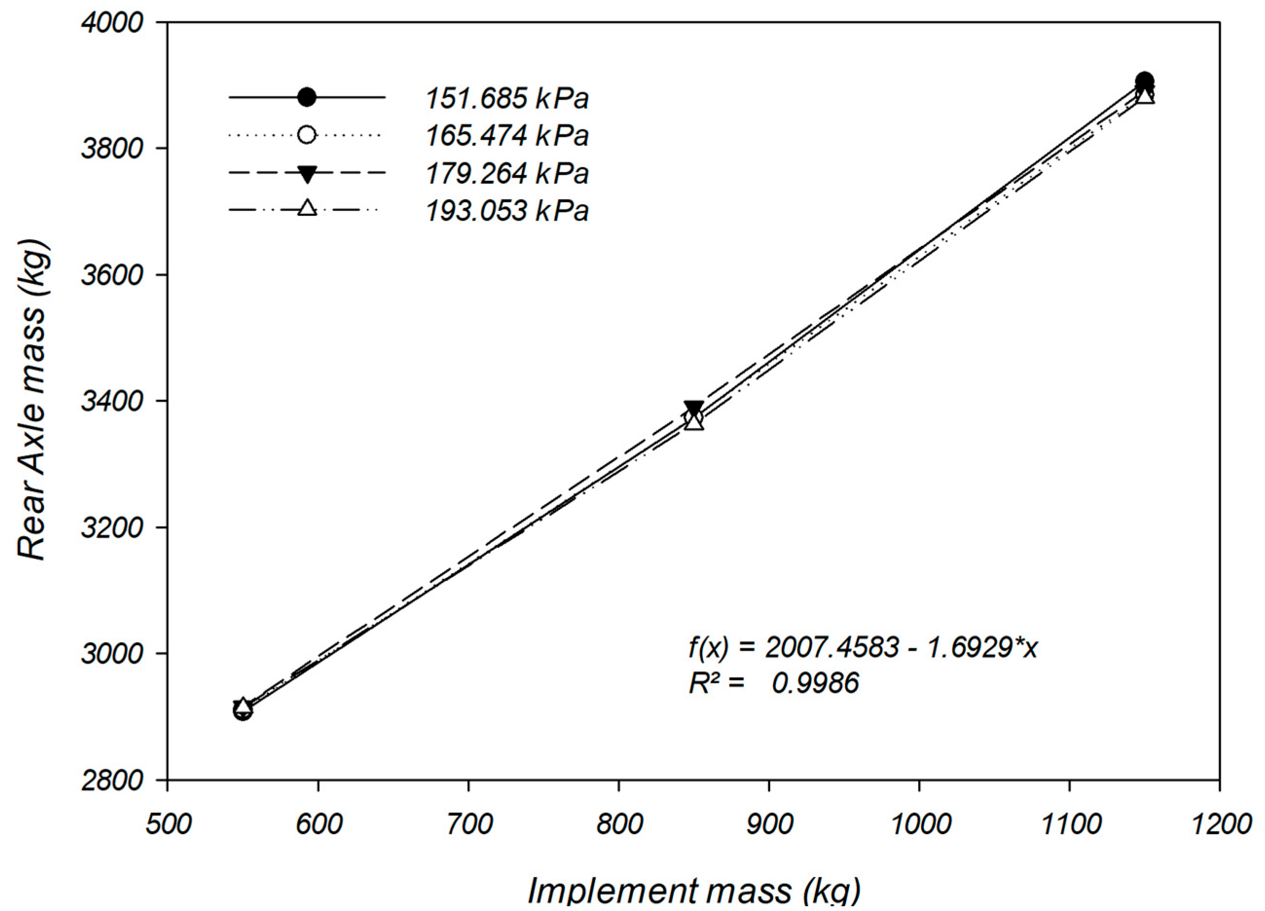 Figure 6 analyzes rear axle mass response as a function of implement mass increase under the same tire pressures evaluated in