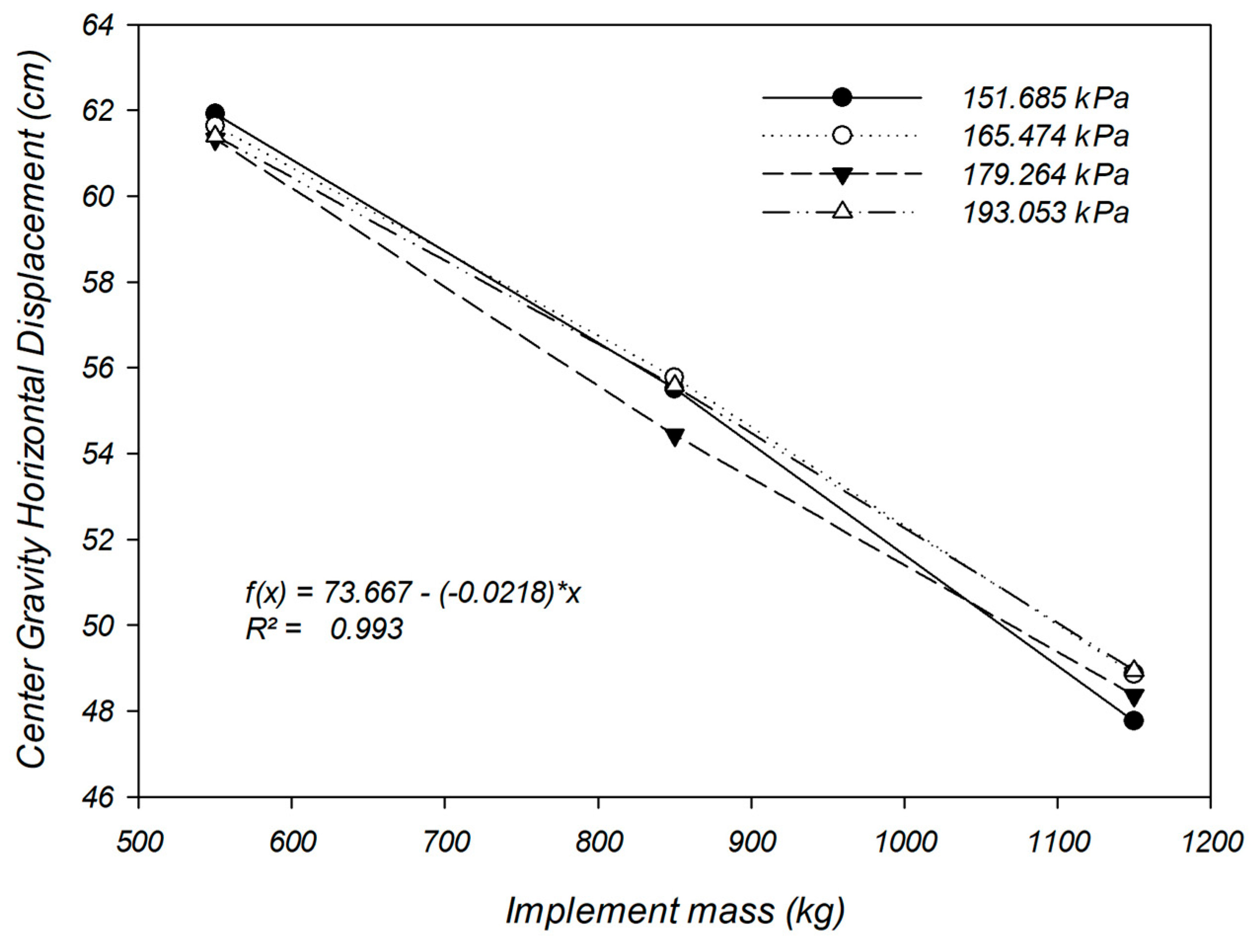2 ≈ 0.99), indicating that the mass increment in the hydraulic system results in systematic CG displacement toward the rear axle. Although implement mass was identified as the main factor, tire pressure and the mass × pressure interaction also had a statistically significant effect on horizontal CG displacement. In the evaluated interval, total CG rearward movement was approximately 21%, bringing the center of gravity closer to the rear axle and consequently negatively influencing the operational safety of the system.