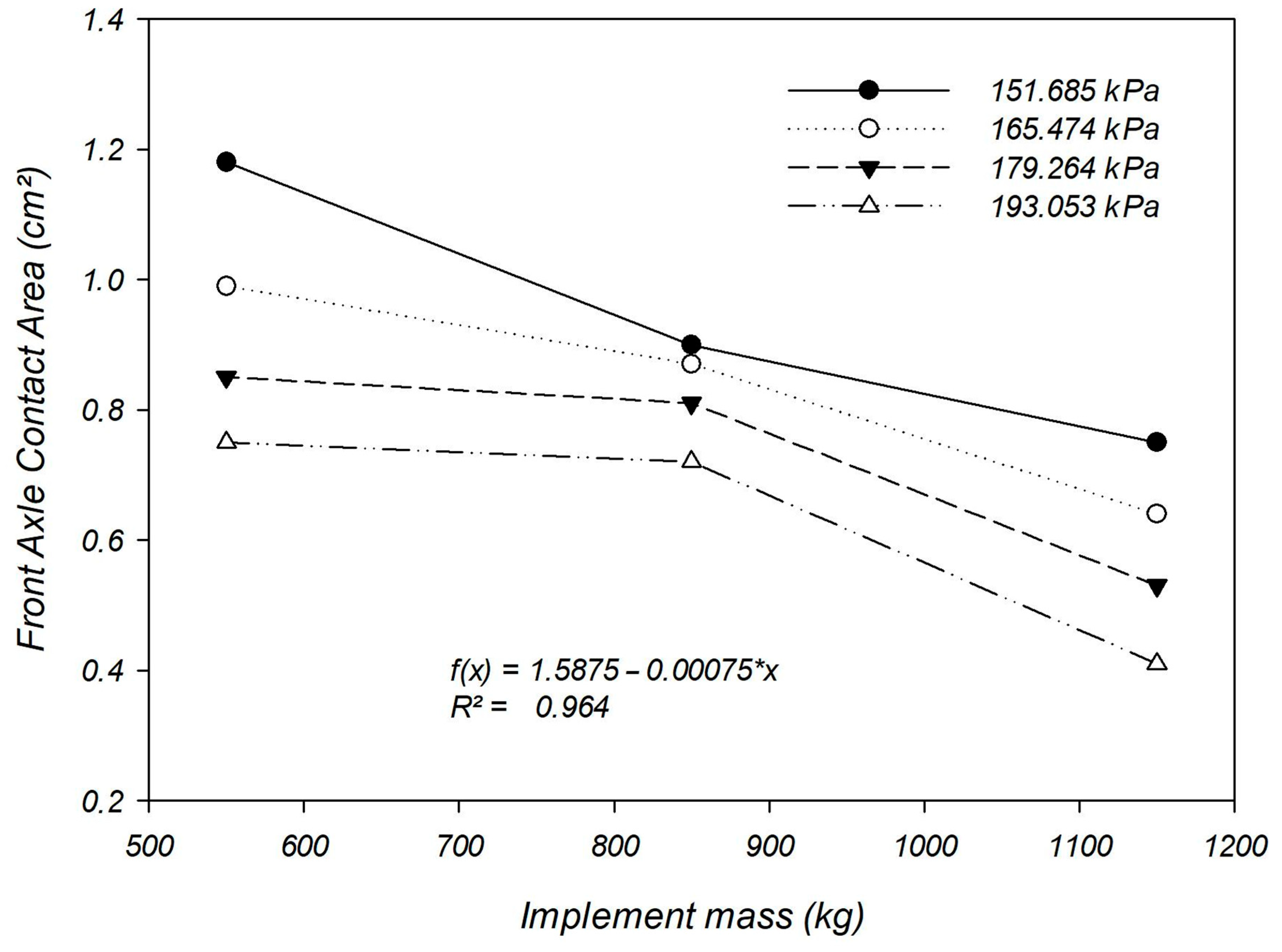 2 under the maximum load condition (1150 kg) and the highest tire pressure (193.053 kPa). The area decrease was systematic at all pressure levels, with the smallest areas always recorded with the combination of highest implement weight and elevated front tire pressure.
