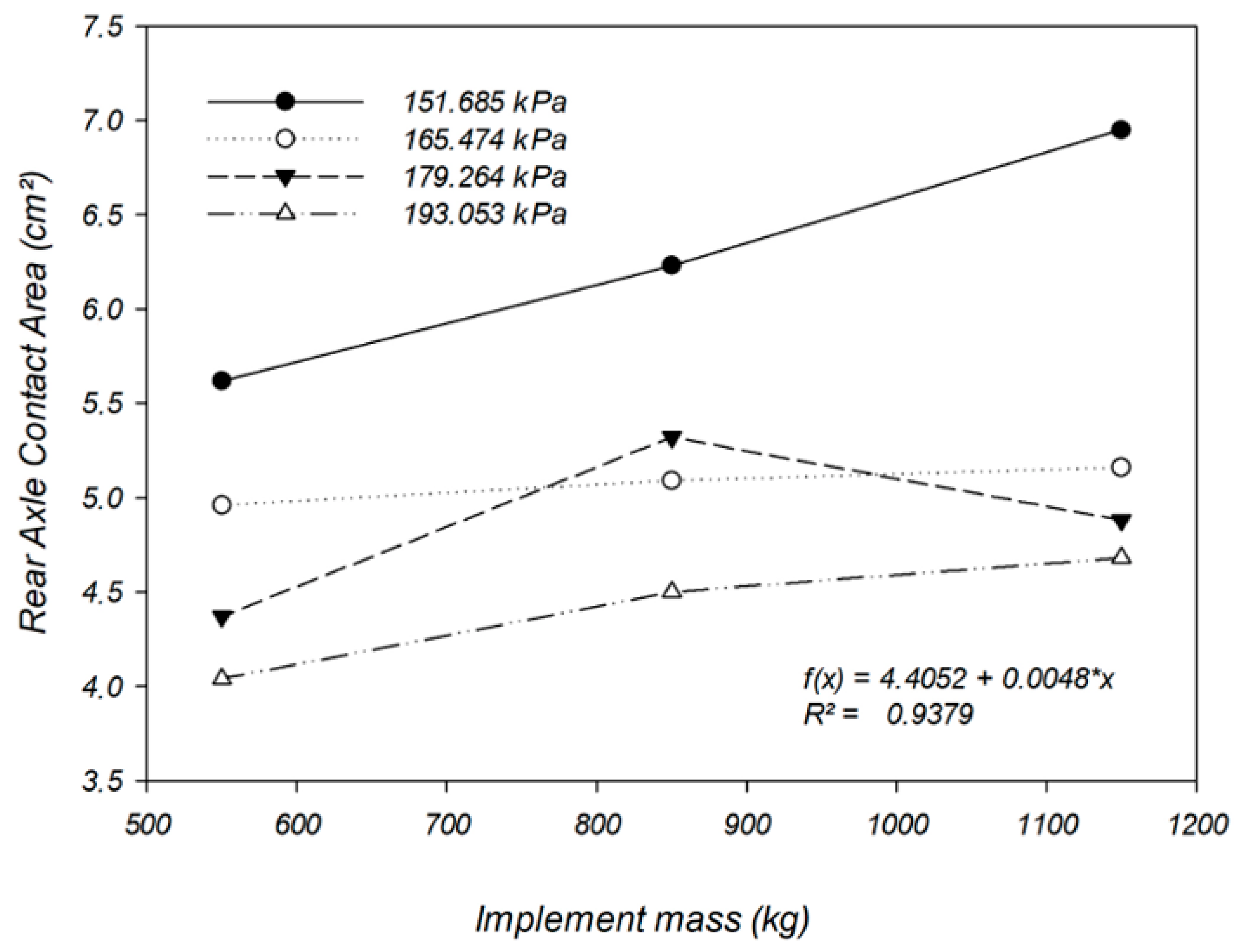 Figure 9 presents rear tire contact area variation as a function of implement mass and tire inflation pressure. At the lowest inflation pressure (151.685 kPa), the tire contact area increased from approximately 5.8 cm