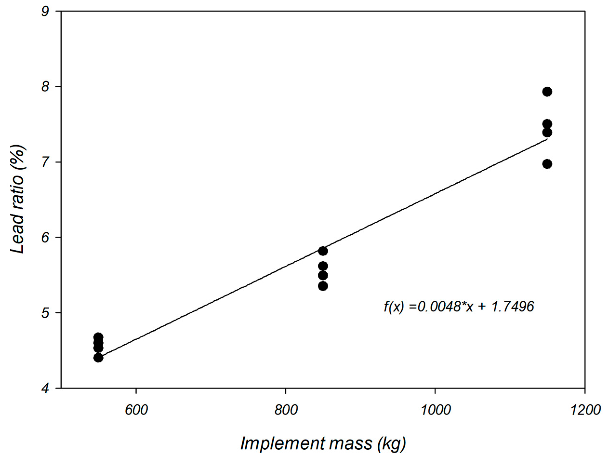 Moreover, an increase in the lead ratio was observed as implement mass increased, remaining within acceptable operational limits (<5%) only when the sprayer tank was empty. Lead ratios exceeding this threshold compromised traction efficiency and resulted in increased fuel consumption and accelerated wear of transmission components. These effects are attributable to the elevated lead ratio induced by rear axle overload and load redistribution, as demonstrated by [