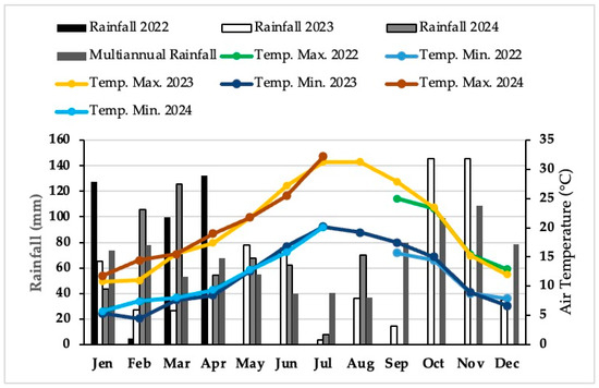 Total monthly rainfall (mm), multiannual rainfall data (2002–2024), average minimum and maximum air temperatures (°C) in the experimental area over the trial duration.