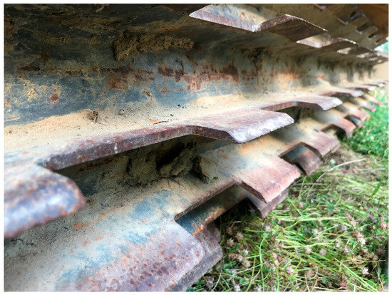 Roller crimper is an implement consisting of a cylindrical roller with blades mounted on its outer surface in various shapes and arrangements. As it passes through the field, the blades crush the cover crop stems without cutting them [14,15]. This crimping causes injuries that promote plant desiccation [16]. Several models of roller crimpers are available on the market for vineyard applications. These are generally rear- or front-mounted implements with different frame types, such as fixed, hydraulically side-shifting, or telescopic frames with multiple modules to adjust working width [16,17,18]. Cutter arrangements can be tangential and staggered, as in the widely used arrangement, or helical [16,19]. Cutter profiles are usually chisel-shaped or flat. Roller crimpers produce larger residue fragments even distributed on the field, resulting in more persistent mulch compared to mulching mowers, which, instead, produce finer residues [20,21]. Optimal termination of the cover crop is crucial to avoid water and nutrient competition with vines and to ensure efficient agronomic management [13]. Studies have shown that roller crimper intervention is more effective when the cover crops reach certain phenological stages [22]. For example, according to Miville and Leroux [23] the optimal stage to use roller crimper is from the 70% flowering stage in broadleaf species and from anthesis in grasses. Specifically, regarding Vicia villosa Roth, Kenee et al. [24] found that terminating the crop at full flowering resulted in 98% biomass suppression, compared to 80% at an earlier stage.