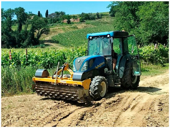 - Gagliardi, L.; Luglio, S.M.; Peruzzi, A.; Fontanelli, M.; Frasconi, C.; Raffaelli, M. Comparative Analysis of the Performance of a Chain Mower and Tools That Perform Under-Row Weed Control with Tillage in the Vineyard. Agronomy 2024, 14, 206. [Google Scholar] [CrossRef]