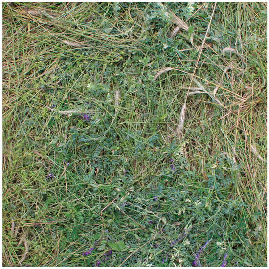 The plant termination rate over time after the roller crimper’ interventions was estimated as percentage of plant material greenness. To measure this parameter, digital images of the lodged plants were acquired and subsequently analyzed using the Canopeo app (MathWorks, Inc., Natick, MA, USA) [25,33]. The app calculates for each processed image the percentage of green pixels relative to the total number of pixels, thus allowing to obtain the percentage of green cover of the plant material. This method was chosen because the color of the tissues in plants cut down by the roller crimper, in which photosynthetic activity is likely compromised, tends to shift away from green hues over time. During both years of the trial, photographic surveys were carried out immediately after the first pass with the roller crimper, daily for one week, and subsequently at a frequency of approximately one survey every two days. Specifically, in 2023, photographic surveys were carried out on June 8, 9, 10, 11, 12, 13, 14, 15, 17, 20, 22, 24, 26, 28, and 30, as well as on July 3 and 5. In 2024, photos were taken on June 7, 8, 9, 10, 11, 12, 14, 15, 18, 20, 21, 24, 26, and 28, and on July 1, 3, and 5. During each photographic survey, three digital images were collected for each replicate within a square meter frame (1 m × 1 m) that was fixed over dates (Figure 4).