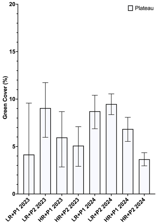 Values of plateau for the four systems in 2023 and 2024. Error bars indicate the estimate lower and upper limit at the 95% confidence interval. LR + P1—light roller crimper configuration with one pass; LR + P2—light roller crimper configuration with two passes; HR + P1—heavy roller crimper configuration with one pass; HR + P2—heavy roller crimper configuration with two passes.