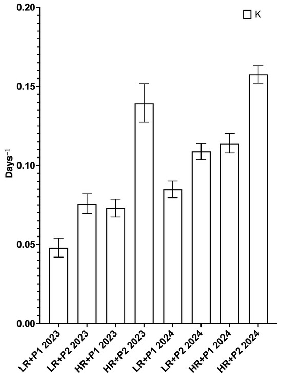 In both the trial years, the k parameter values of the HR + P2 system (0.14 and 0.16 in 2023 and 2024, respectively) were higher compared to HR + P1 (0.07 and 0.11 days−1 in 2023 and 2024, respectively), LR + P2 (0.08 and 0.11 in 2023 and 2024, respectively) and LR + P1 (0.05 and 0.08 in 2023 and 2024, respectively) with an average percentage increase of 72.7, 60.2 and 140.0%, respectively (Figure 8). No difference emerged among HR + P1 and LR + P2, while LR + P1 obtained the lowest values.