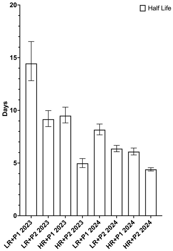 Concerning the half-life parameter, the LR + P1 system (14.45 days) obtained a higher value compared to LR + P2 (9.16 days), HR + P1 (9.50 days), and HR + P2 (4.97 days) in 2023 (Figure 9). The same trend was observed in 2024, with values of 8.16, 6.37, 6.09, 4.40 days for LR + P1, LR + P2, HR + P1 and HR + P2, respectively.