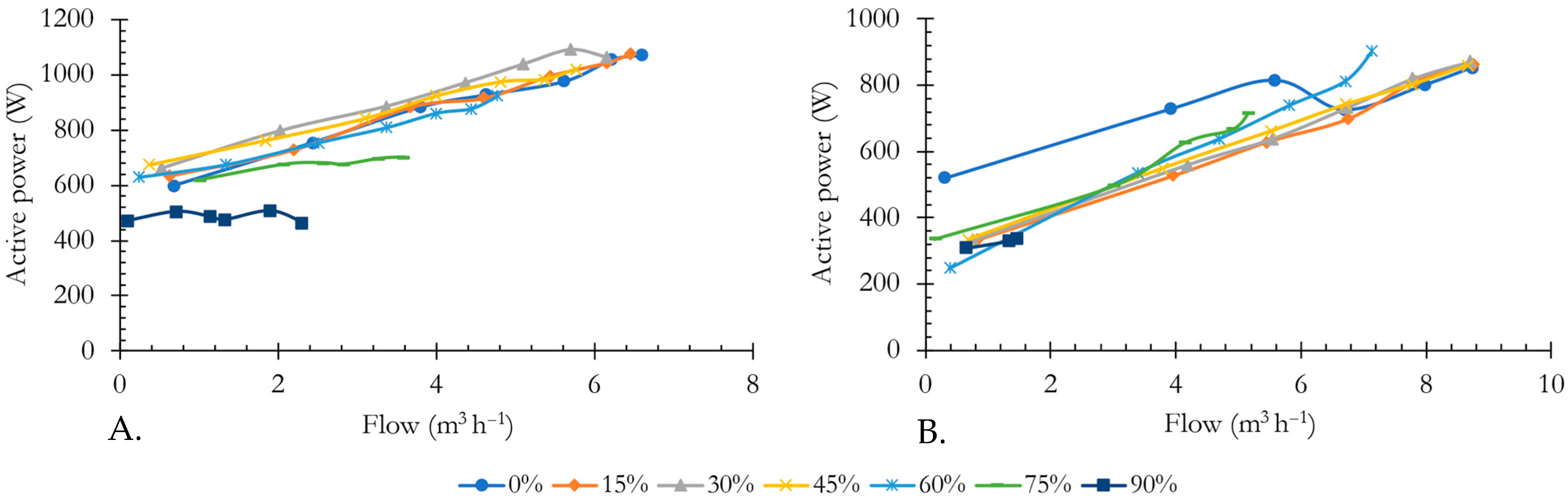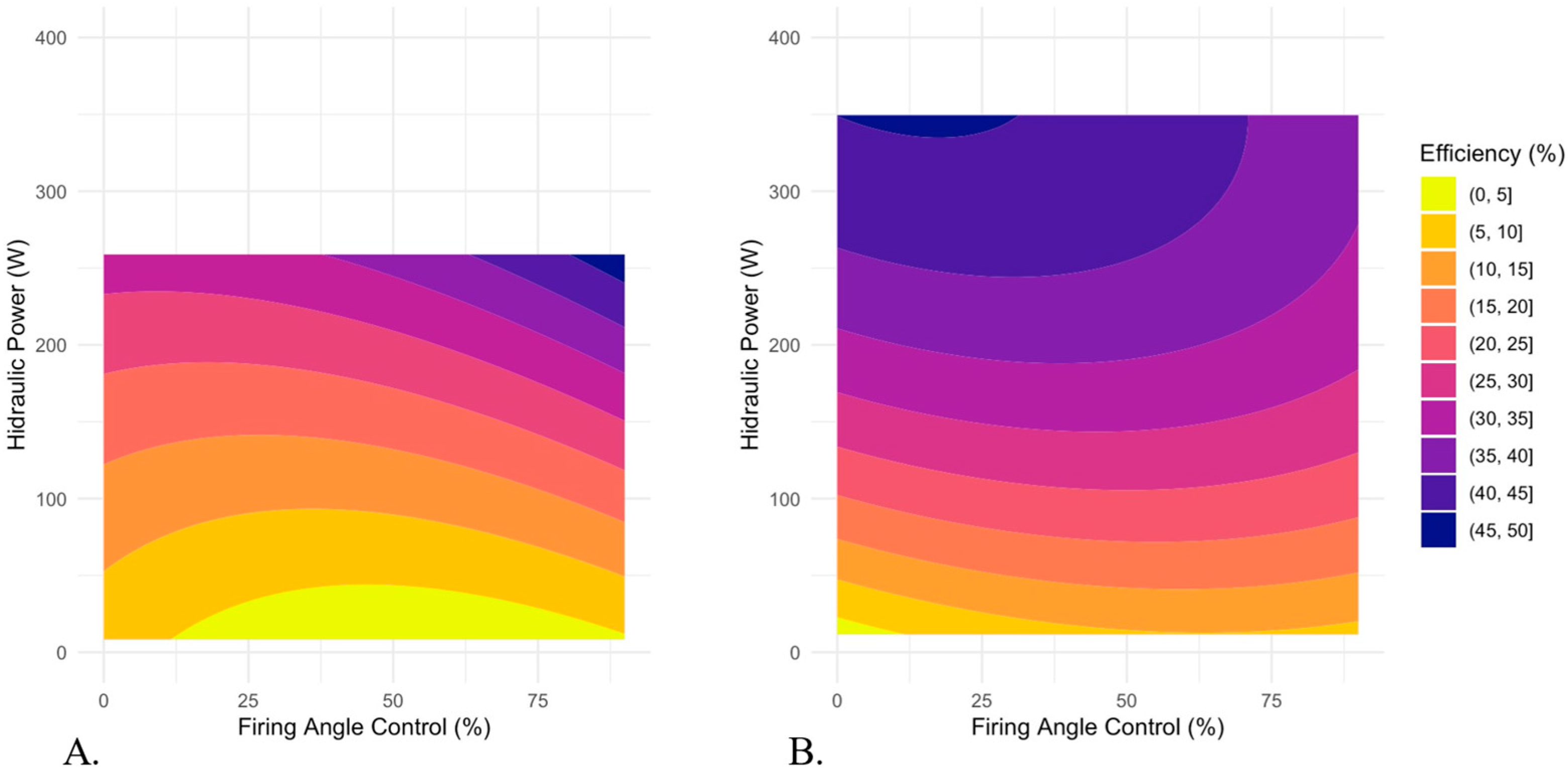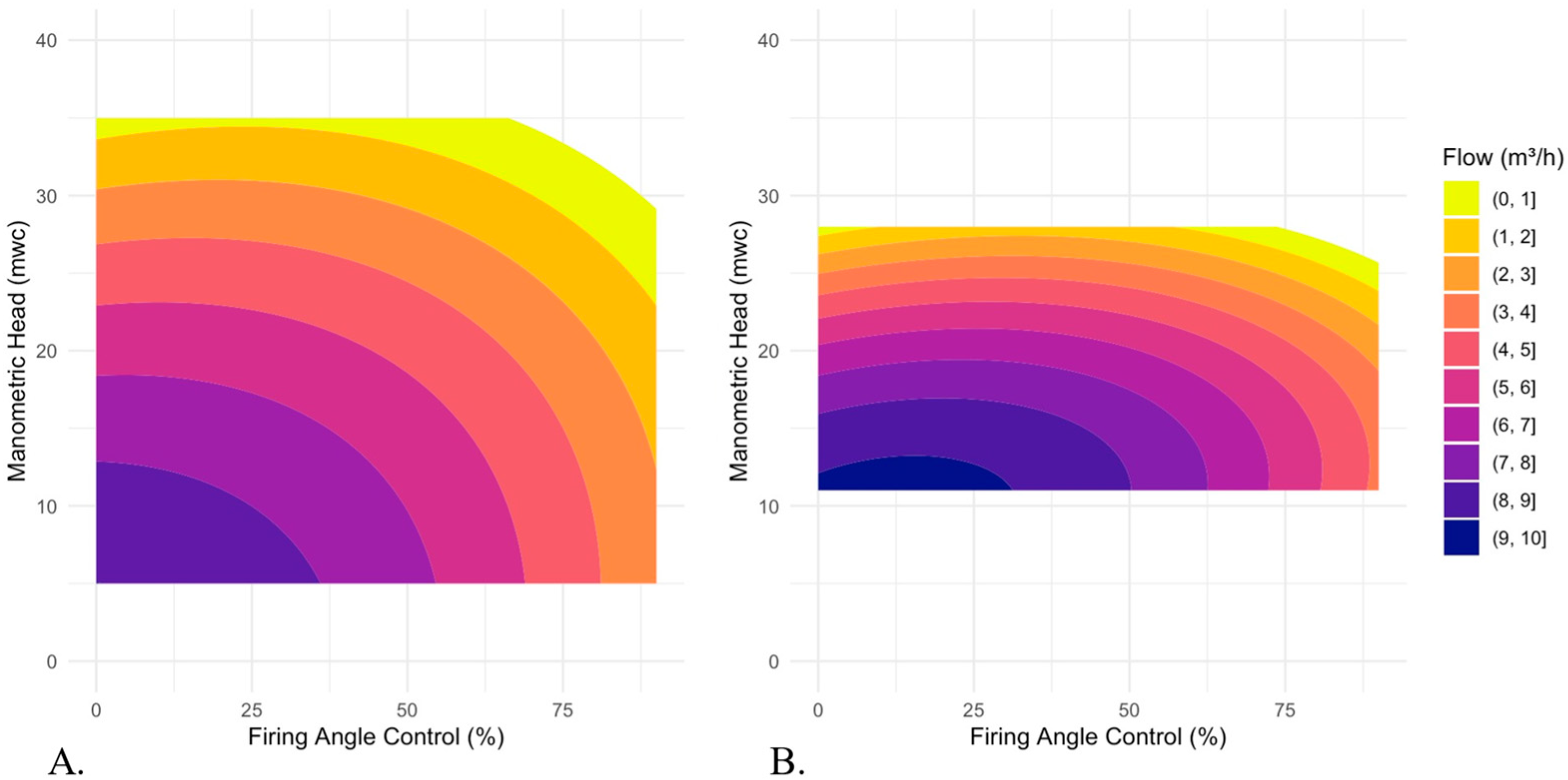 2.5. Experimental Tests: Electrical and Hydraulics Performance of Motor Pumps Under Firing Angle Control