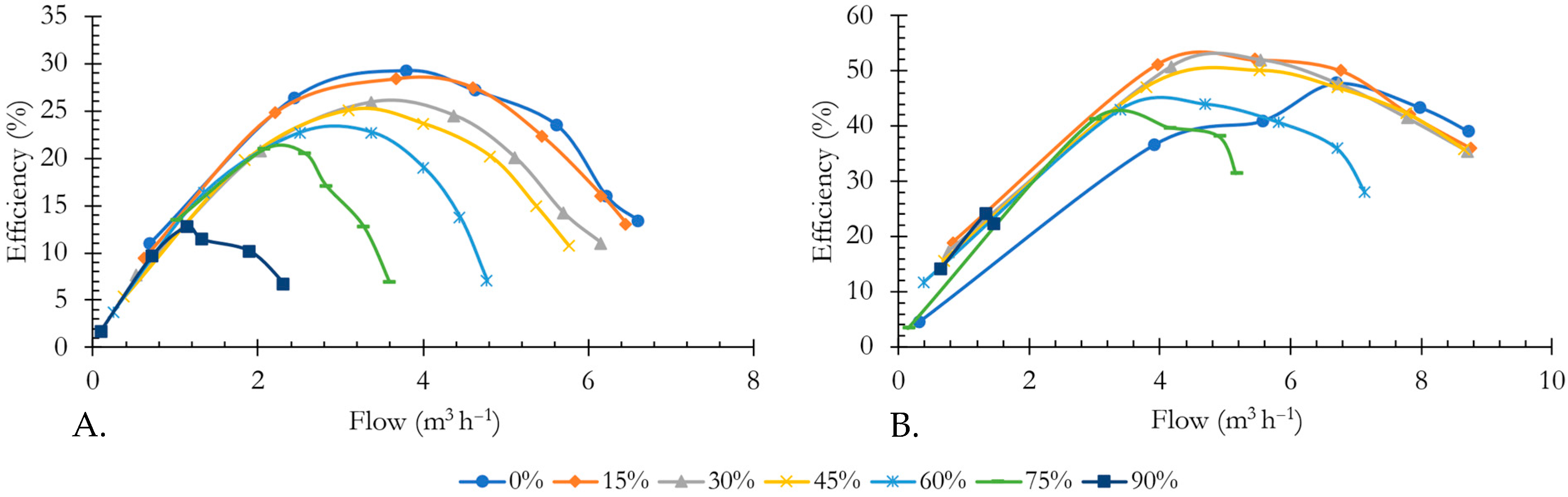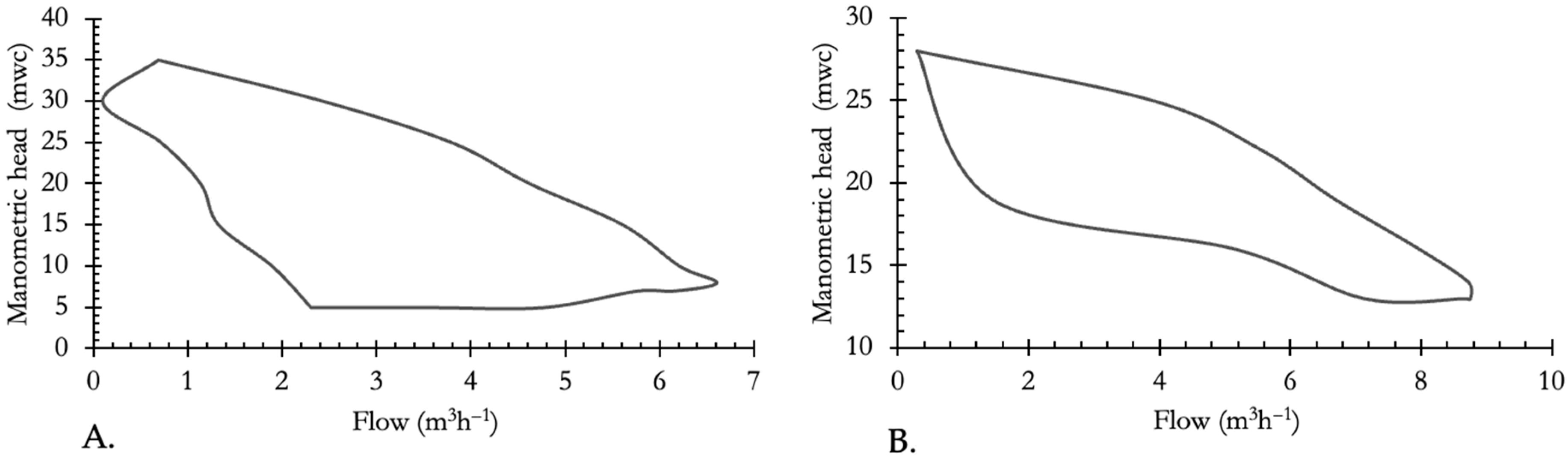4.2. Characteristic Curves of Pumps and Range of Operations