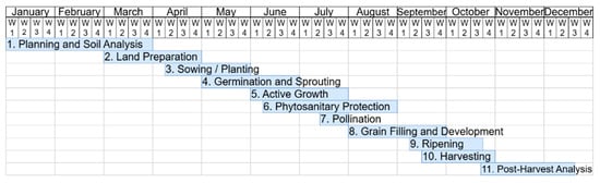 Figure 1 illustrates a Gantt chart representing the annual phenological stages of maize cultivation. In the proposed FMIS, each stage is supported by dedicated functional modules, with one or more specialized microservices managing specific phases. A centralized component provides an overarching view of the entire cultivation process, enabling coordinated decisions that enhance productivity.