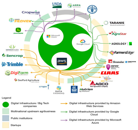 Major platforms, including those developed by multinational agribusinesses (e.g., John Deere, BASF, Syngenta) and agri-tech startups (e.g., CropX, Taranis), are hosted on AWS, Microsoft Azure or Google Cloud. This illustrates not only the technological convergence of the industry, but also the growing risk of vendor dependence, as digital agriculture becomes closely tied to a small number of infrastructure providers. While this concentration facilitates scalability and interoperability at global scale, it also raises questions regarding affordability, data sovereignty and long-term sustainability for small and medium farms in developing regions.