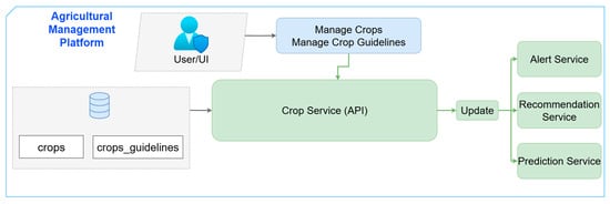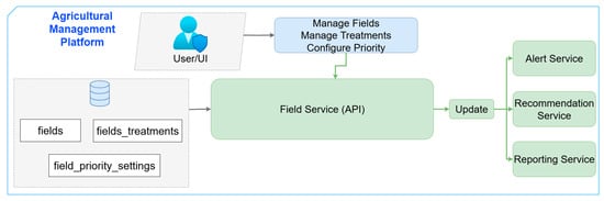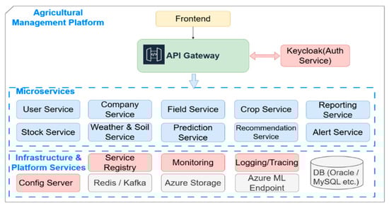 A modular and domain-specific microservice architecture is used by the FMIS to improve system robustness and agility. Each service can grow, change, or be replaced separately thanks to this design, which does away with the strict dependencies that characterize monolithic systems. Without affecting already existing components, the system may adapt to new data types or functionality as they are introduced, such as integration with aerial images or sophisticated forecasting algorithms. Precision agriculture’s flexible, future-ready decision-making framework is supported by this modular separation, which guarantees consistent and effective data flows [21,22].