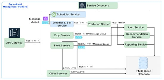 Before presenting the technical details of each microservice, we provide in Figure 4 a high-level overview of the AgriMicro architecture. This diagram highlights the conceptual interactions between the core services (Weather & Soil, Crop, Field, Prediction, Recommendation, Alert, Reporting) and their connection with the FMIS Cloud Database. External users and applications interact through the API Gateway, while service discovery and message queues coordinate the internal communication between services. The purpose of this overview is to offer readers a clear picture of how the components fit together within the Edge–Fog–Cloud framework, facilitating the subsequent detailed description of each module.