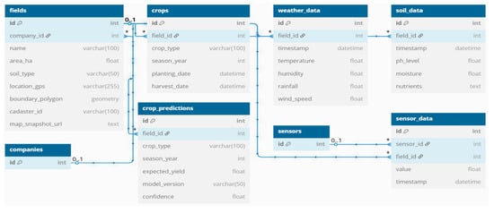 A simplified segment of the relational cloud database schema is illustrated in Figure 5, highlighting the core entities used for environmental monitoring, crop tracking, and yield prediction. The Field Service manages the registration and geospatial definition of agricultural plots, using attributes such as area of the fields, soil type, GPS coordinates, and field boundaries. Crop data are maintained by the Crop Service, which links each cultivated plot to seasonal information such as crop type, planting and harvest dates, and associated input usage [19].