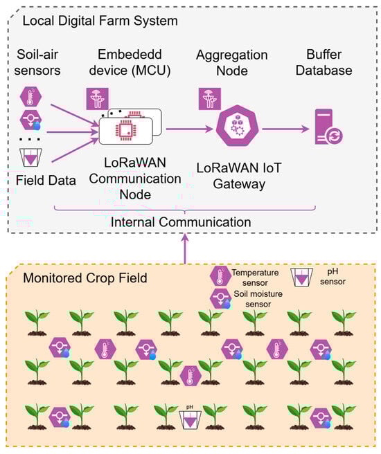 Using a dispersed network of sensors placed throughout the farm, raw field data are gathered. These sensors monitor a number of agro-environmental factors including temperature, precipitation, light intensity, and soil moisture. To guarantee continuous monitoring, sensor readings are taken at regular intervals of 15 to 60 min in the experimental setup. The main gathering point is a central gateway (IoT aggregation node), to which data from sensor nodes is wirelessly sent via LoRaWAN [23,24]. Especially for small to medium-sized plots, this communication solution was chosen due to its ease of setup and compatibility with existing infrastructure.