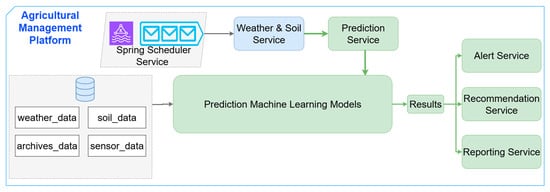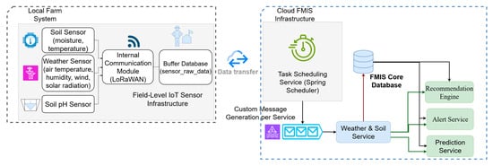 The FMIS converts unprocessed sensor data into useful information and tangible operational choices through the Prediction, Recommendation, and Alert services. Within the farm ecosystem, the complete data pipeline—from wireless transmission and sensor-level gathering to automated preprocessing and temporary buffering to real-time analytics and decision support—forms an integrated digital workflow. By enabling quick reactions to shift circumstances and guaranteeing that choices are based on up-to-date, scientifically supported information, this microservice-based design makes intelligent farm management possible [31].