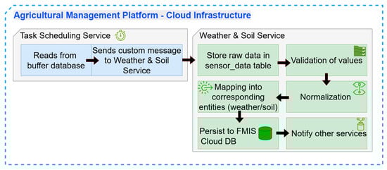 The Weather & Soil microservice’s internal data input process is shown in Figure 8. The Task Scheduling Service starts the process by automatically retrieving newly buffered data from the temporary database every 15 min. This scheduler, which is implemented using Spring Boot’s Scheduled Service, manages the ingestion workflow by producing structured messages that are sent to the Weather & Soil service’s controller layer, where they start validation and additional processing.