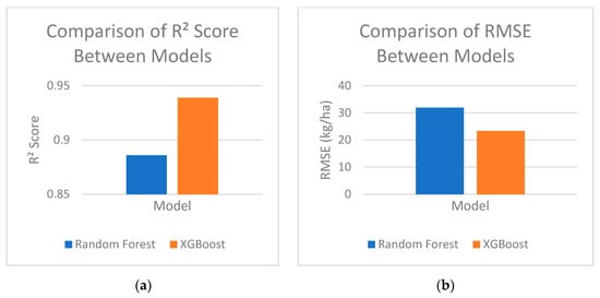 (a) Coefficient of determination (R2) for Random Forest and XGBoost (b) Root Mean Squared Error (RMSE) for Random Forest and XGBoost.