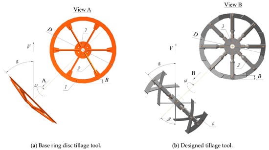 Theoretical studies enabled the analysis of motion trajectories and the identification of three distinct operational phases based on the rotation angles θh1 and θh2. The developed kinematic model provided crucial insight into the mechanism of soil–tool interaction during the soil treatment phase. This staged approach confirmed that effective soil sliding along the cutting blade of disc tillage tools did not occur within the optimal kinematic range of η = 1.0–1.2 for all angles of attack, underscoring the need for improving the design of traditional tillage discs. A ring tillage disc with circular cutting blade for surface soil treatment was selected as the base tillage tool. The determination of the optimal blade inclination angle β = 38–42° and its elliptical-profile configuration represents a significant advancement, as these parameters ensure the conditions for smooth soil sliding (β < 90 − φ1) throughout the entire working period. These results agree well with the fundamental principles of soil–tine interaction established by Aluko and Seig and Amantayev et al. [28,29].