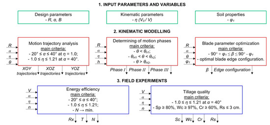 The initial stage of this research is represented by kinematic modelling with motion trajectory analysis. Then the phases of operation of the tillage tool are considered. After that, the parameters of the cutting blade are substantiated. The final results of the research are an evaluation of the energy efficiency and tillage quality of tillage tools in the field.