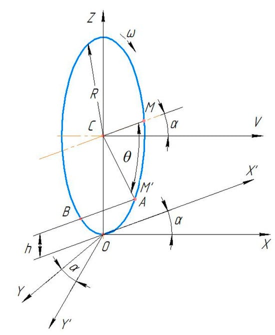 The origin coincides with the bottom point O of the tillage tool at the furrow bottom. OX represents the forward travel direction V of the tillage tool. OZ is the vertical direction and passes through the bottom contact point O of the tillage tool with the furrow bottom. OY is the transverse direction. The rotation plane of the tillage tool is inclined from the forward travel direction at an angle of attack, α. The auxiliary coordinate system OX’Y’Z’ is created by rotating the main system OXYZ through an angle, α, with respect to the axis OZ.