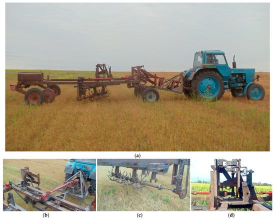 Mobile dynamometer rig with Belarus-80 tractor: (a)—general view; (b)—torque measuring unit; (c)—rotary tillage tool unit; (d)—tensometric unit.