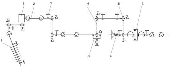 Kinematic scheme of mobile dynamometer rig: 1—gang of rotary tillage tools; 2—cardan drive; 3—overrun clutch drive; 4—overload clutch drive; 5—sprocket; 6—chain drive; 7—support; 8—angle gearbox; 9—torque measuring unit.