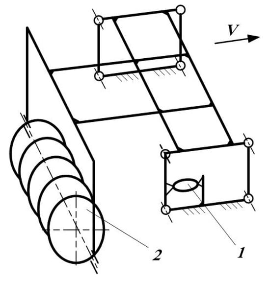 The energy efficiency of the designed PTO-powered rotary tillage tools with elliptical cutting blades was evaluated in terms of specific draught force, torque, and total power requirements. For doing so, a tensometric unit was mounted on the trailer’s frame to measure the draught force acting on the gang of rotary tillage tools during the soil treatment process (Figure 4c). The tensometric unit is a parallelogram mechanism oriented in the forward travel direction, with a strain gauge sensor (1) as its measuring element (Figure 6). The gang of rotary tillage tools (2) is connected to the tensometric unit.