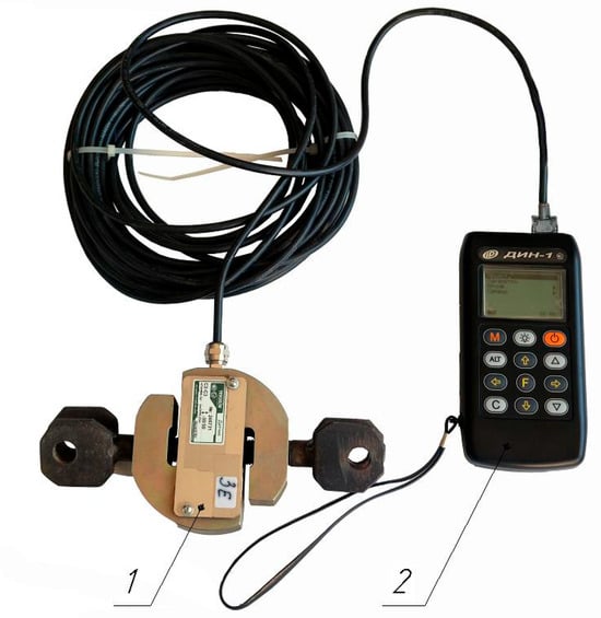 Strain gage instrumentation for force measurements: 1—Tenso-M strain gauge sensor; 2—electronic Dynamometer Universal (DYN-1U) (complied by Amantayev M.).