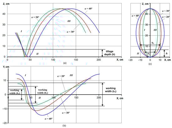 Trajectories of points on the blade edge of the rotary tillage tool during 1 revolution in the XOY (a), XOY (b), and YOZ (c) planes depending on the angle of attack α at a kinematic coefficient of η = 1.0.