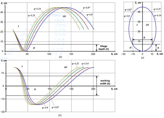 Trajectories of points on the blade edge of the rotary tillage tool during 1 revolution in the XOY (a), XOY (b), and YOZ (c) planes depending on the kinematic coefficient η at an angle of attack of α = 40°.