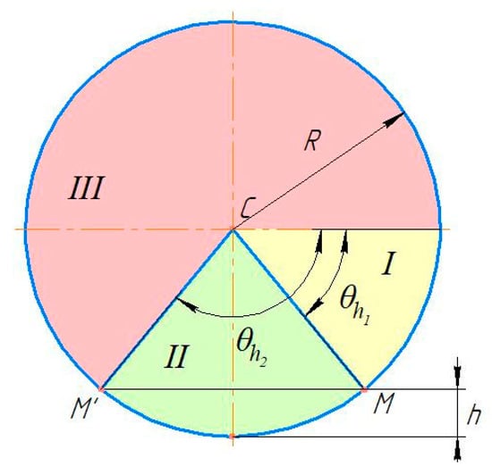 The period during which point M on the blade edge is in the soil is determined by the angles θh1 and θh2 (Figure 10). The first angle θh1 corresponds to the position of the radius-vector CM at the moment when point M enters the soil, and the second angle θh2 corresponds to the moment when it exits the soil. The angles θh1 and θh2 are determined from Equation (1) under the condition Z = h: