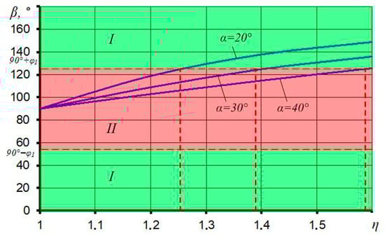 Effect of kinematic coefficient η and angle of attack α on angle β of the base tillage tool. I—soil sliding zone; II—non-sliding zone.