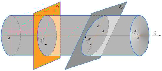 The base ring disc tillage tool features a circular edge of the cutting blade lying in the plane F1 (Figure 13), oriented perpendicular to the vector of absolute velocity Va. This configuration prevents soil sliding along the cutting blade. During motion, the edge point’s trajectory describes a cylindrical surface.