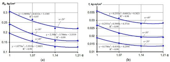 Effect of the kinematic coefficient η and angle of attack α of the designed rotary tillage tools on (a) specific draught force RX and (b) specific torque T.