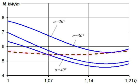 In Figure 15, the effect of the kinematic coefficient η and angle of attack α of the designed rotary tillage tools on specific total power requirements, No, for the soil tillage process is presented. The graph shows that with an increase in the kinematic coefficient η from 1.0 to 1.21, the specific total power requirements No first decreased and then increased for all angle-of-attack values. With an increase in the angle of attack from 20 to 40°, the specific total power requirements reduced by 1.2–1.3 times.