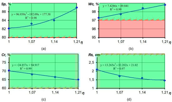 Effect of the kinematic coefficient η on tillage quality of the designed rotary tillage tool: (a)—soil pulverization; (b)—weed cutting; (c)—crop residue retention; (d)—roughness of the field soil surface.